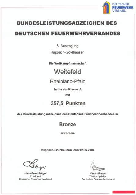 MONTABAUR/RUPPACH-GOLDHAUSEN. Als bisher erste Mannschaft aus dem Kreis Altenkirchen hat die Feuerwehr Weitefeld am Wettkampf um den Deutschlandpokal des DFV teilgenommen. Hierbei gelang bei 45 Gruppen auf Anhieb ein Sprung auf den 22. Platz. Dank einer fehlerlosen Übung mit anschliessendem Staffellauf erwarb die Gruppe aus Weitefeld das Bundesleistungsabzeichen in Bronze.