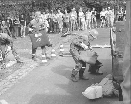 Dies war der erste Teil der Übung, als zweites erfolgte die Rettung einer verunglückten Person, die unter dem Anhänger eines Traktors eingeklemmt war. Dazu wurde der Verletzte (eine Puppe) mit einer Decke zugedeckt. Der Anhänger musste mit einem Luftkissen hochgehoben werden, um die Person zu befreien. Diesen Übungsteil hatte Kay Kirchhöfer geplant und durchgeführt. Natürlich waren unter den Beobachtern auch einige der erwachsenen Feuerwehrleute wie der Wehrführer Peter Pauschert, der sich nach ersten Erkenntnissen positiv über den Verlauf der Übung ässerte.