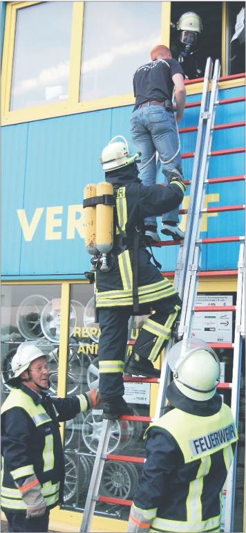 Das Szenario: Eine Reifenhalle steht komplett in Flammen. Der Rauch ist in die benachbarte Werkstatt und in die Büroräume gezogen, in denen sich allerdings noch zwei Personen aufhalten. Kurz nach dem Eintreffen legten die Feuerwehrleute auch schon die Leiter ans Fenster. Eine Person wurde, mit dem Seil gesichert, über die Sprossen gerettet, die andere mit einer Trage durch das Innere des Gebäudes in Sicherheit geschafft. Danach begannen die Blauröcke mit dem Löschen des vermeintlichen Brandes.