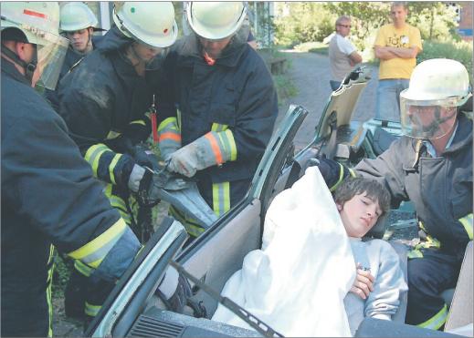 27 Feuerwehrleute (zwei davon vom Löschzug Weitefeld) waren mit vier Fahrzeugen vor Ort, und gleich 30 Rettungskräfte des Arbeiter-Samariter-Bundes (ASB) aus Düsseldorf kamen mit acht Wagen hinzu. Die ASB-Leute haben zurzeit ein Ferienlager auf der Pracht in Niederdreisbach aufgeschlagen - der Einsatz war selbstverständlich im Vorfeld abgesprochen. "Es ist sicherlich außergewöhnlich, mit dem ASB zusammenzuarbeiten", bestätigte Einsatzleiter Sven Meyer. Der Brandmeister ist in Düsseldorf bei der Berufsfeuerwehr angestellt und kennt daher die Hilfsorganisation. Bei der Befreiung der eingeklemmten Opfer kamen Rettungsschere und Spreizer zum Einsatz. Dabei ließen sich die Feuerwehrleute allerdings Zeit. "Damit die Kameraden ein Gefühl für die schweren Geräte bekommen", erklärte Einsatzleiter Meyer. Die "Opferdarsteller" hatten ein mulmiges Gefühl bei der Rettung, auch wenn ein Feuerwehrmann zu ihnen in den Wagen stieg, um die beiden zu beruhigen. Während sie im Auto ausharrten, knarrten von außen die Maschinen mit unbändiger Kraft. "Beifahrer" Philip Müller aus Niederdreisbach bestätigte: "Ich hab" gehofft, dass die das schnell hinkriegen und mich dabei nicht verletzen."