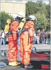 Unter Atemschutz wurden zunächst die verletzten Personen aus der brennenden Halle befreit. Dann wurde umgehend mit den Löscharbeiten begonnen. Die Wasserversorgung wurde per Unterflurhydranten und aus dem Löschteich des Eisenwerks aufgebaut. Die eingeklemmte Person wurde mit einem Hebekissen gerettet - eine Kombination aus Wagenheber und Luftmatratze. Nun hatten die "Marsmännchen" ihren Auftritt: In knallorangen Gummianzügen samt Atemmaske untersuchten die Männer des Gefahrstoffzugs die auslaufende Flüssigkeit. Hierbei ist besondere Vorsicht geboten - schließlich kann man nie genau wissen, ob man es mit einer harmlosen oder gar hochgiftigen Substanz zu tun hat. Nach kurzer Zeit hatten die Kameraden die Situation im Griff, die vermeintliche Gefahr war gebannt.