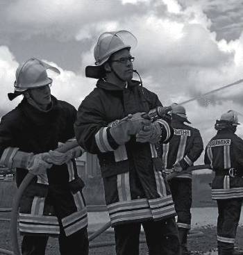 Das Szenario: Ein Kleinflugzeug muss notlanden und gerät in Brand. Dabei läuft Kerosin aus, und die Flammen breiten sich über zwei Flugzeughallen aus. Als erstes war die Flughafenfeuerwehr vor Ort, angeführt von Einsatzleiter Jens Wildfeuer. Sie retteten mehrere verletzte Personen unter Atemschutz. Auch befreiten sie den Piloten aus dem Kleinflugzeug. Dabei war Fantasie gefragt, denn die Kameraden zerlegten mit ihren schweren Geräten einen alten Pkw, der als Flugzeug herhalten musste. Die nachrückenden Löschzüge Derschen und Friedewald kümmerten sich sodann um die beiden Flugzeughallen - die Kameraden aus Daaden verhindern ein Übergreifen der Flammen auf ein benachbartes Firmengelände. Für die Löschzüge Niederdreisbach und Weitefeld hatte sich Wildfeuer etwas Besonderes ausgedacht: Sie retteten eine lebensgroße Puppe, deren Bein unter einem Traktor eingeklemmt war. In unmittelbarer Nähe: ein Behälter mit Gefahrenstoff.