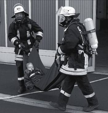 Mit größter Vorsicht nähern sich die Feuerwehrleute, warten zunächst auf Atemschutzgeräteträger. "Es gibt Stoffe, da nimmt man zwei Atemzüge - und man fällt um", erklärt der Gruppenführer der Niederdreisbacher Wehr, Sven Meyer. Erst als klar ist, dass der Behälter dicht ist, können sie die Puppe retten. "Wir können ja nicht unsere eigenen Leute verheizen", sagt Meyer und macht deutlich, daß sie erst handeln können, wenn die äußeren Umstände klar sind. Mit einem so genannten Büffelheber wuchten sie den Traktor schließlich ein wenig nach oben und können somti den Verletzten retten. Der erste Zug aus der VG Daaden war 16 Minuten nach Alarmierung vor Ort, der letzte vier Minuten später. Bei der relativ weiten Anfahrt sei "das völlig in Ordnung", sagte VG-Wehrleiter Peter Pauschert, zumal die Kameraden nichts von der Übung wussten. Mit 13 Autos und 80 Leuten rückten die fünf Daadener Löschzüge zum vermeintlichen Brandort aus.