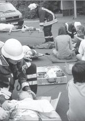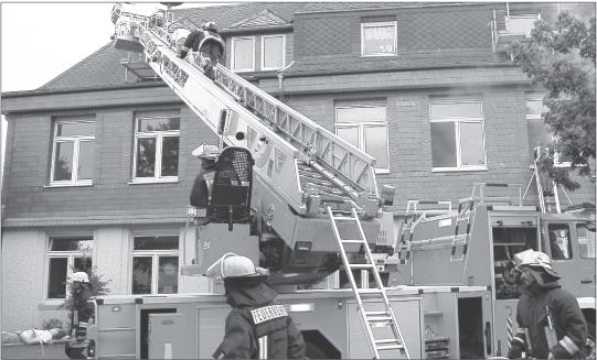 -Samariterbundes. Der ASB mit Regionalbereitschaftsleiter Christoph Eckel hatte zum vierten Mal sein Ausbildungslager in Weitefeld aufgeschlagen und machte bei der Übung mit. Feuerwehren und Rettungswagen, insgesamt 13 Fahrzeuge, rauschen Schlag auf Schlag heran. Zuerst die Weitefelder, die gleichzeitig den Atemschutztrupp klar machen, Schläuche ausrollen und Leitern anlegen. Verstärkung bei der Personenrettung bekommen sie von den Niederdreisbachern. Die Blauröcke liefern die Verletzten so rasch an, dass sie mit dem Aufbau der Zeltstation unter Zeitdruck geraten. Aber auch sie lassen sich nicht verrückt machen, begnügen sich in diesem Fall auch nicht mit Mimen, sondern verwenden konkretes Material und legen sorgsam Verbände an. Als die Betzdorfer Drehleiter vor Ort ist, kann noch eine "Lehrerin" aus oberen Raumgefilden geholt werden und auch der arme "Hausmeister", der erfolgreich "reanimiert" wird. Meyer ist im Ganzen zufrieden mit der Meisterung der Aufgaben. Nicht aber damit, dass es im für die Koordination zuständigen Einsatzleitwagen akustische Probleme durchs Arbeiten mit 2