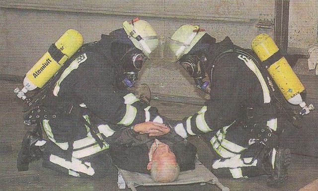 Rasch waren die Einsatzkräfte vor Ort, und angesichts des vorgegebenen Szenariums hatte selbstverständlich die Personenrettung Vorrang. Sieben Menschen galt es aus der Halle und dem Rauch an die frische Luft und damit aus der Gefahrenzone zu bringen. Dies gestaltete sich für die Helfer gar nicht so einfach, da alle Personen ohnmächtig waren und somit niemand durch Rufe oder Schmerzensschreie auf sich aufmerksam machen konnte.