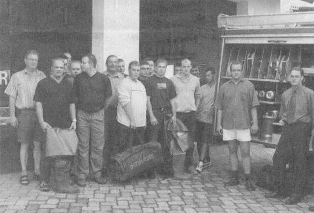 Mit vier Feuerwehrautos und einem Bus der Firma Knautz starteten sie am 21. August um 3 Uhr morgens in Richtung Friedersdorf. Dank der Firmen Muhr und Bender, Baumgarten sowie Roth & Weber, die den Floriansjüngern Sonderurlaub gewährten, konnten die 25 Männer sich - vom ADD Trier offiziell entsendet - auf den Weg machen.
