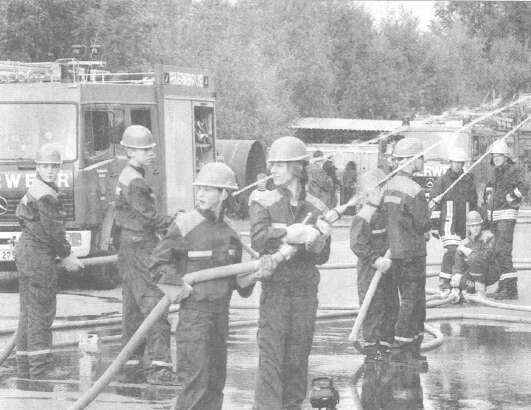 Angenommen wurde ein technischer Defekt, der zum Feuer und das wiederum zum Einsatz der Jugendlichen geführt hatte. 29 Jungen und Mädchen bewiesen Sachverstand, als sie 120 Meter B-Schlauch legten und mit neun C-Rohren löschten. Drei Fontänen, die aus verschlissenen Rohren schossen, mussten sie in Kauf nehmen.