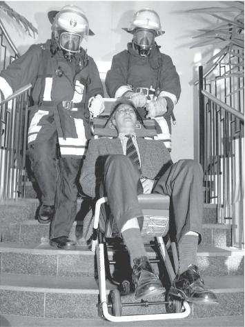 Bei einer Großübung im Altenheim in Langenbach bei Kirburg kam erstmals auch ein neuer Rettungsstuhl zum Einsatz, der seit langem auf der Wunschliste stand. Möglich wurde die Anschaffung durch eine Anschubfinanzierung von 400 Euro, die der Lions Club Bad Marienberg für das 1700 Euro teure Gefährt beisteuerte. Der schmale, treppengängige "Evac-Chair" ermöglicht den schnellen Personentransport aus der Gefahrenzone, wie Lions- Präsident Thomas Brass (Foto) selbst testete. Damit haben die Lionsfreunde aus dem Westerwaldkreis und dem Landkreis Altenkirchen bereits den zweiten Rettungsstuhl für eine Senioreneinrichtung mitfinanziert.
