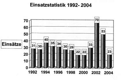 In der Dienstveranstaltung am 22. November 2004 wurde von Wehrleiter Peter Pauschert die Jahresstatistik für den Einsatzzeitraum 15.11.2003 - 15.11.2004 vorgestellt. Die Verwaltung nimmt dies zum Anlass, anhand von Diagrammen und Schaubildern detailliert über die gefahrenen Einsätze der Löschzüge zu berichten.