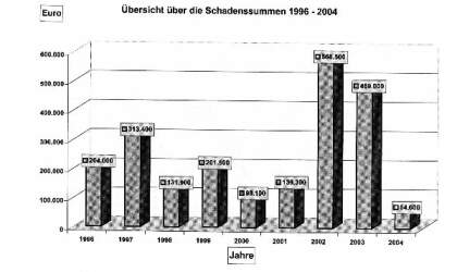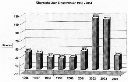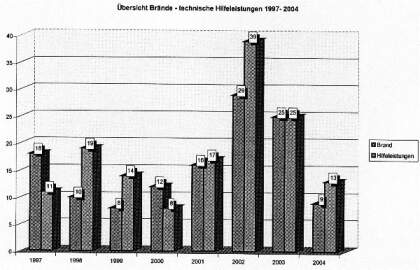 Gegenüber 123 Einsatzstunden von 577 Feuerwehrleuten in 2003 waren in diesem Jahr bislang nur 36 Stunden von 187 Kräften zu leisten. Die geschätzte Schadenssumme reduzierte sich von 469 000 Euro (2003) auf 54 600 Euro. "Das ist gut so", kommentierte Pauschert. Außerdem freute er sich darüber, dass keine Unfälle bei den Einsätzen zu verzeichnen waren.