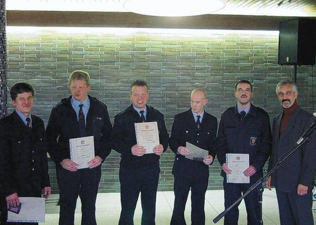Im Anschluss gab es Ehrenurkunden für Christoph Flug, Hans-Werner Strunk, Horst Strunk und Franz Pauschert, die schon 25 Jahre ihren Dienst in der Freiwilligen Feuerwehr leisten. Für 35 Jahre aktiven Dienst wurden Paul-Gerhard Tielmann und Hans-Günter Kray ausgezeichnet. Jörg Hölzemann wurde zum Oberbrandmeister befördert, zum Gruppenführer bestellt wurden Matthias Theis und Andre Düster. Andreas Pauschert und Jan Lerch erhielten ihre Bestellung zum Atemschutzgerätewart und ihre Ernennung zum Löschmeister nach einem entsprechenden Lehrgang. Auch Sven Oliver Meyer ist ab jetzt Atemschutzgerätewart. Manuel Treude wurde zum Gerätewart bestellt sowie zum Löschmeister. Auch Kevin Josten ist jetzt Löschmeister; beide haben die erforderlichen Lehrgänge absolviert.