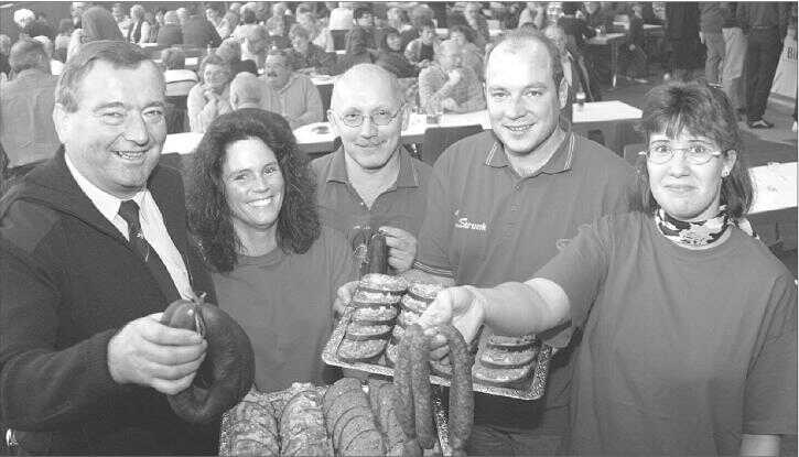 Metzgerschürze statt Uniform: Die Weitefelder Brandschützer tischten über 300 Gästen Fleisch und Wurst bei ihrem nunmehr siebten Schlachtfest auf. Etwa 45 Helfer füllten die Teller mit leckerer Blut-, Mett- und Leberwurst, Sülze und Riesen-Bockwurst, Wellfleisch und Frikadelle, Rippchen und Fleischkäse. Schon nach zwei Stunden waren Dosenwurst und Sülze längst vergriffen - ähnlich knapp wurden die Sitzplätze in der zum Bersten gefüllten Turnhalle. Doch die Stimmung sollte noch einmal steigen: Am Abend heizten DJ Stefan Frisch und Thomas Pfeil (Beschallung) ihren Gästen ein - inklusive Fußballübertragung. Fördervereins-Vorsitzender Siegfried Strunk lachte: "Es ist so voll, wie immer" Darauf sind die Floriansjünger mehr als nur stolz, schliesslich soll der Erlös die Anschaffung von neuen Funk- und Atemschutzgeräten ermöglichen. Fast genauso beliebt wie das Schlachtfest ist die Homepage des Löschzugs: www.feuerwehr-weitefeld.de