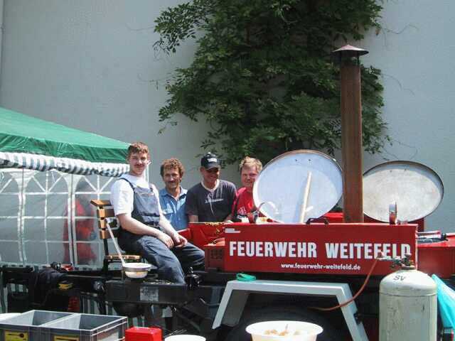 Die Bertha-von-Suttner-Realschule in Betzdorf feierte an mehreren Tagen ihr 100-jähriges Bestehen. Am Samstag blieb auch unsere Feuerwehr nicht ganz unbeteiligt. Der für die Organisation zuständige Festausschuss orderte frühzeitig unsere Gulaschkanone, die bereits früh morgens nach Betzdorf reiste. Dort wurde die "Kanone" mittags, randvoll mit leckerer Erbsensuppe, von den Kameraden Christopher Hees, Martin Schmidt, Rainer Schnell, Klaus Weinbrenner und Heiko Weyand betreut, die von zahlreichen Besuchern Lob für den guten Geschmack ernteten.