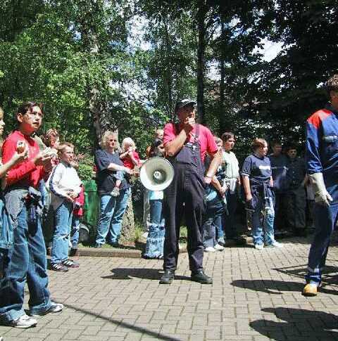 Unser Wehrführer Heiko Weyand, seinerseits auch Schulelternsprecher der Realschule, hatte bereits morgens beim Festkommers eine Rede hinter sich und bereitete sich nachmittags auf seinen nächsten Einsatz vor. Die Schüler der Feuerwehr-AG hatten zusammen mit dem betreuenden Lehrer Helmut Wurm einige Demonstrationen vorbereitet, die von Heiko Weyand per (Mega-)Megaphon kommentiert wurden. Dazu zählten Rettungsaktionen über Leiter und Sprungtuch sowie das Löschen eines "Hausbrandes" mit Eimerkette und Schnellangriff.